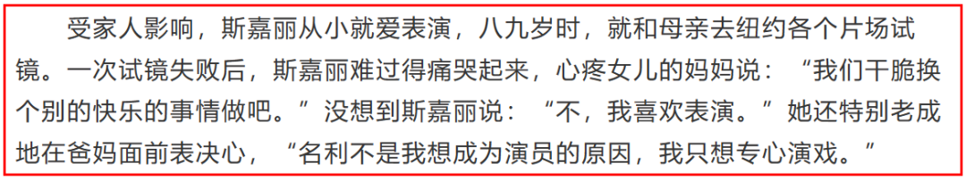 没想到,斯嘉丽坚定地拒绝了母亲:“不,我喜欢表演。”