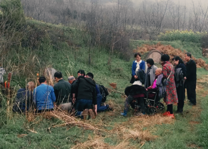 我老婆带着孩子站在路边没有进来,她看到这一幕大声喊着我的名字说赶快跪下。我“扑通”跪下,那片纸也缓缓地落在火堆里。