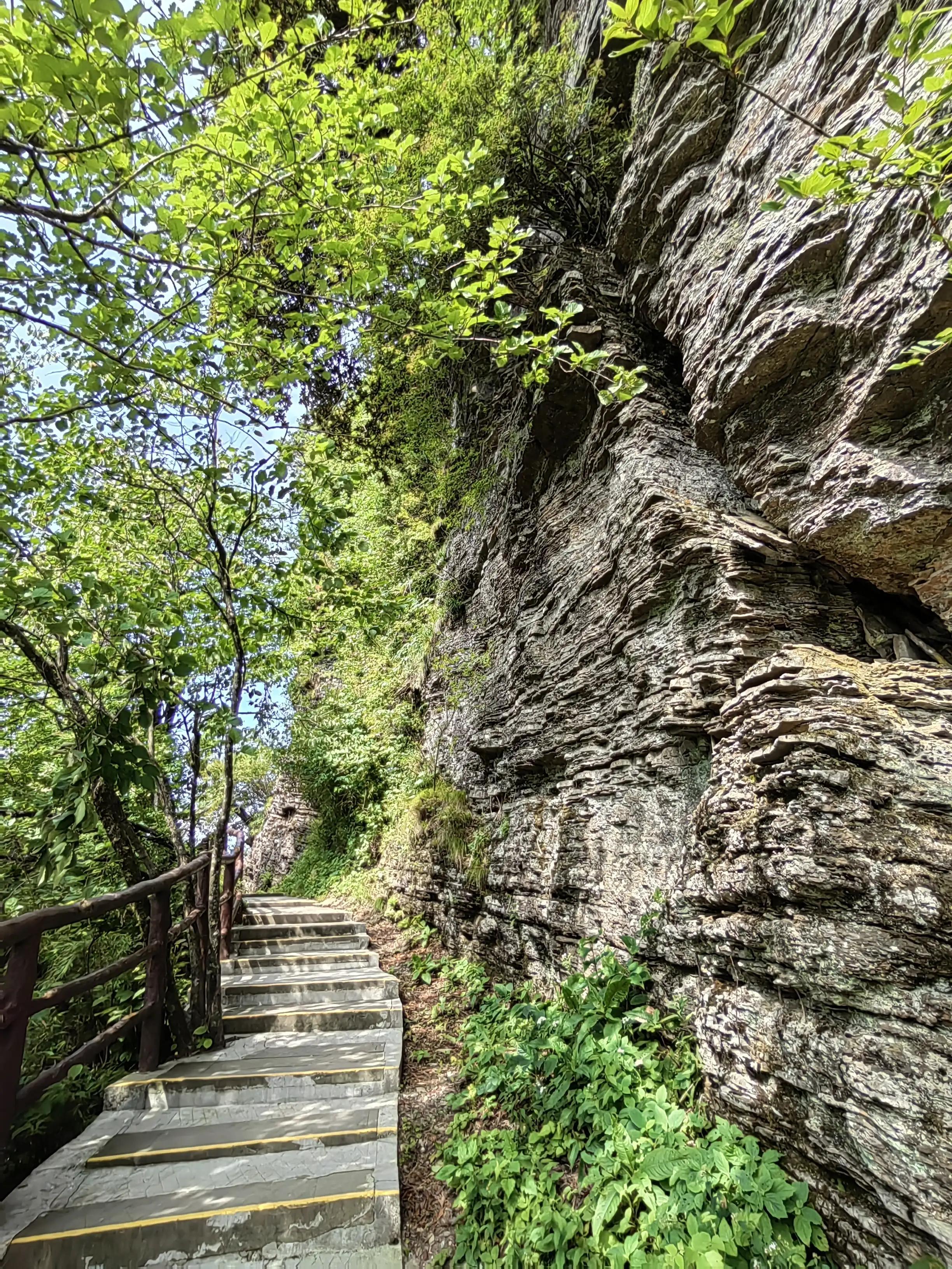 每个山峰之间有栈道相连,部分栈道下面是空的,但是也不吓人,这是上面的风很大,对穿戴帽子和穿裙子的人有一点不太友好。山上有很多几百年树龄的山楂树和杜鹃花树,这种体型比较大的山楂树和杜鹃花树我是见过一些的,但是这么高龄的还是第一次见。