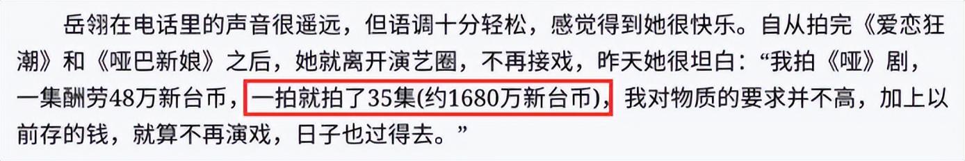 当时她称自己年龄太大了,不会再结婚生子。单靠《哑巴新娘》这一部剧,她就赚了1680万新台币以上(现在约378万人民币),就算退圈没有收入来源,靠以前拍戏的钱,也能过安稳的日子。