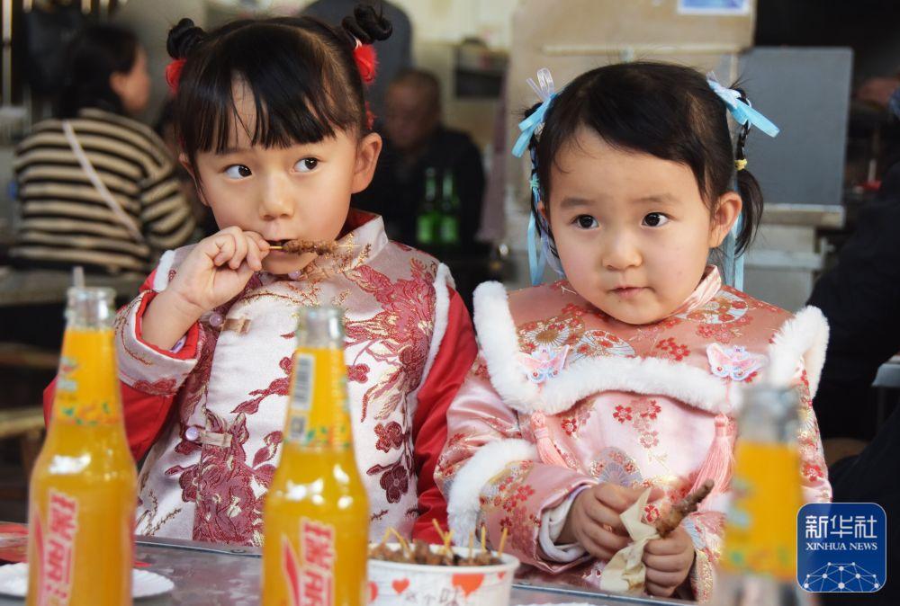 1月22日,在云南省红河哈尼族彝族自治州个旧市一烧烤摊,两名小女孩在享受美食。新华社发 (薛莹莹 摄)